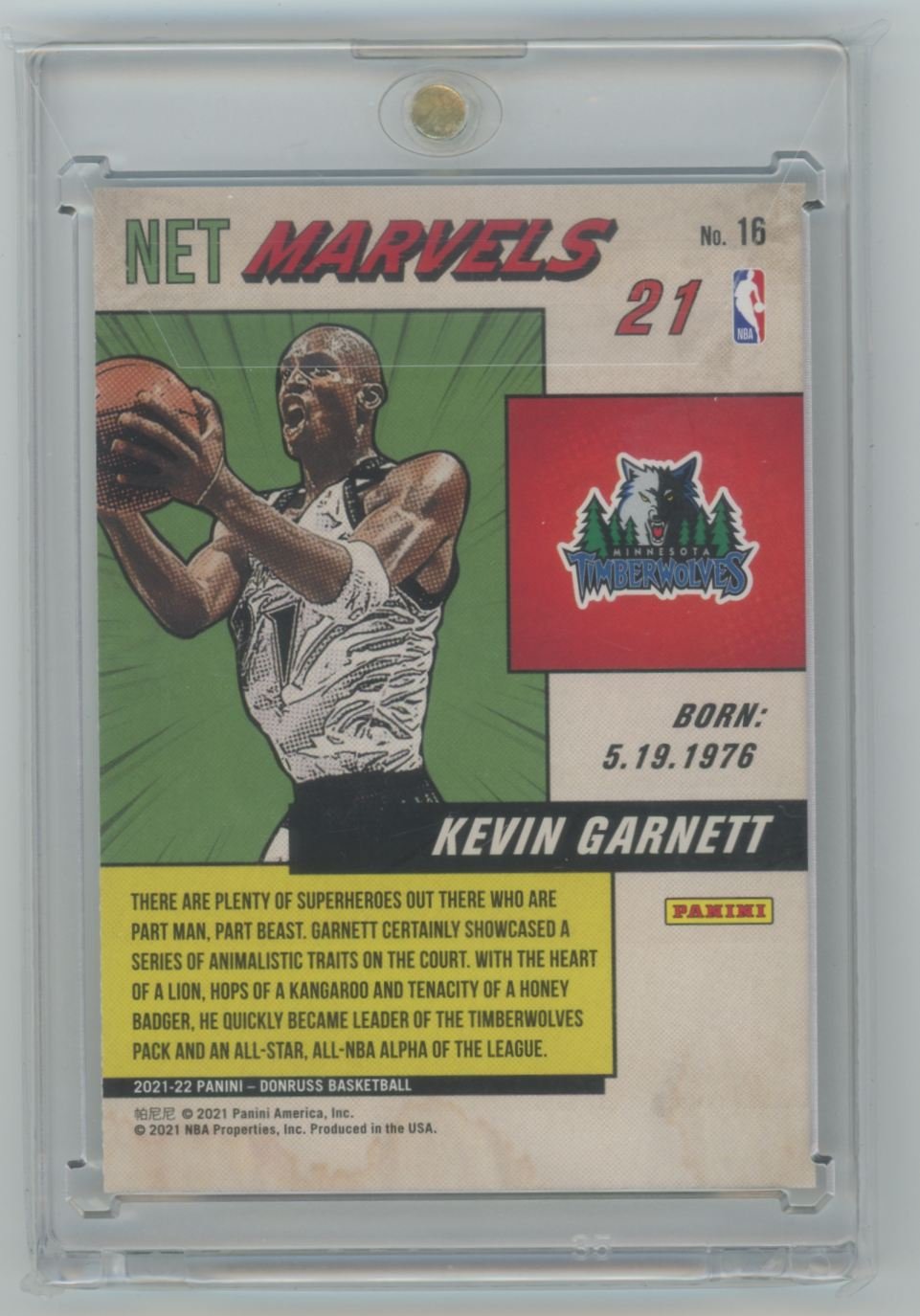 This is a 2021 Kevin Garnett basketball card #16 from the Minnesota Timberwolves in the 2021 Donruss Net Marvels set.