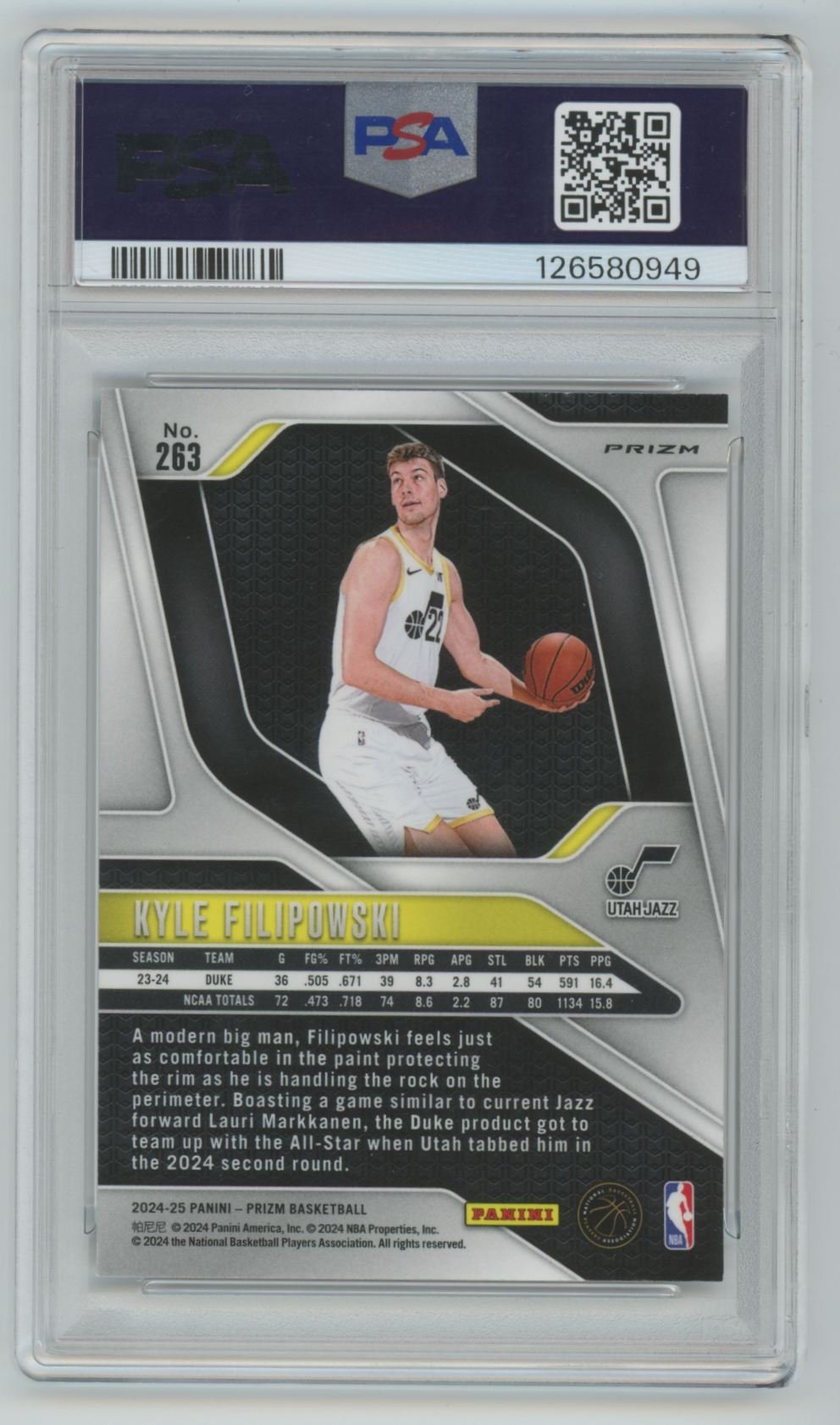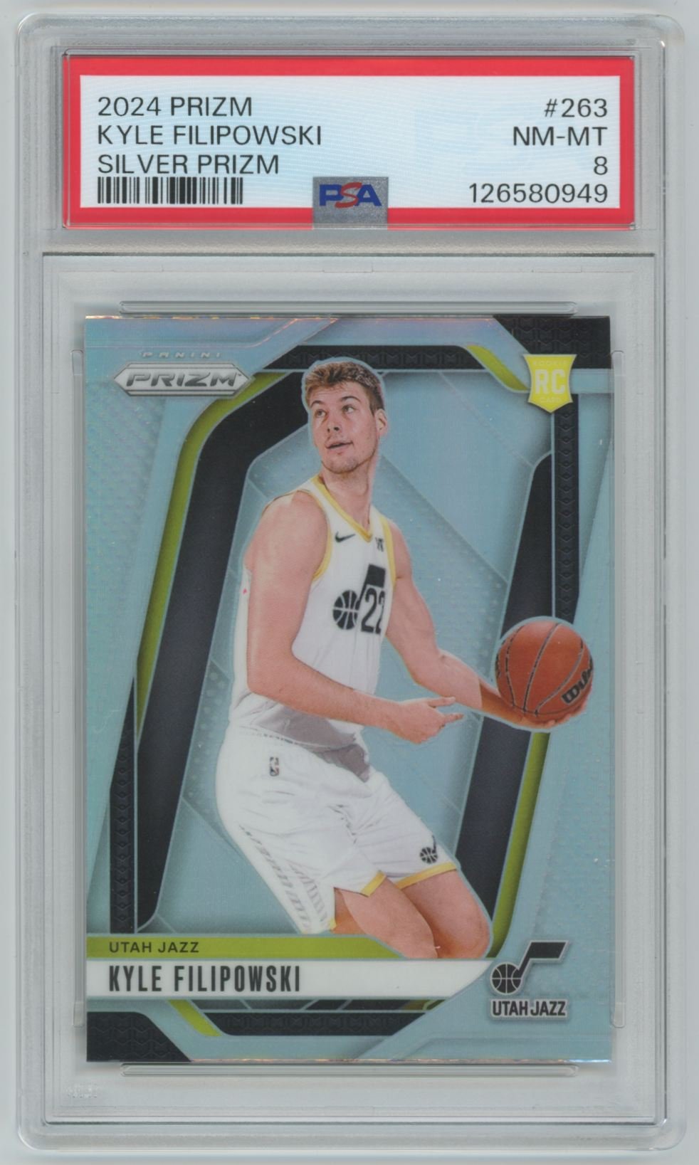 This is a 2024 Kyle Filipowski basketball card #263 from the Utah Jazz in the 2024 Panini Prizm Silver set and is a PSA Grade 8.