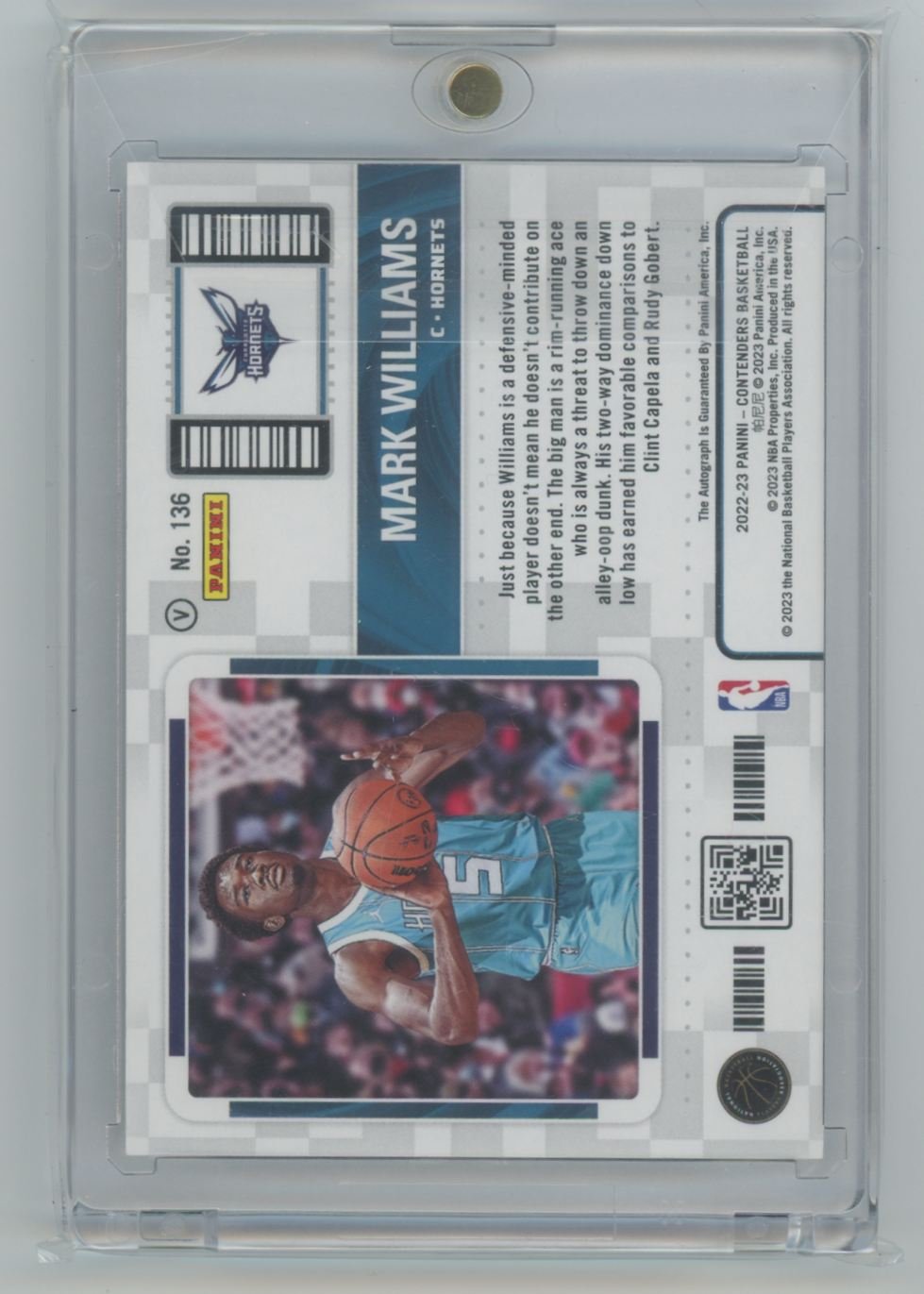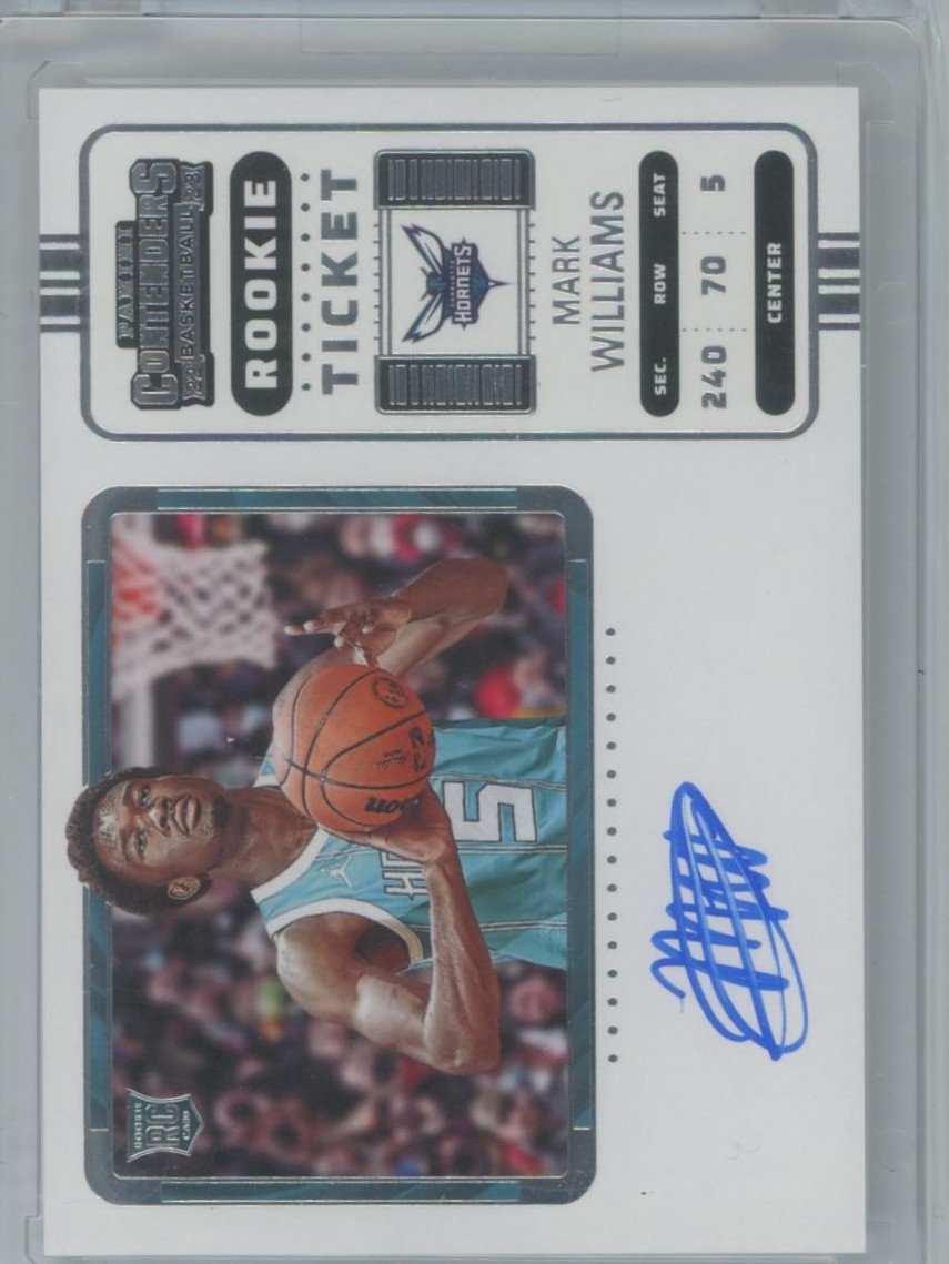 This is a 2022 Mark Williams basketball card #136 from the Charlotte Hornets in the 2022 Panini Contenders set.