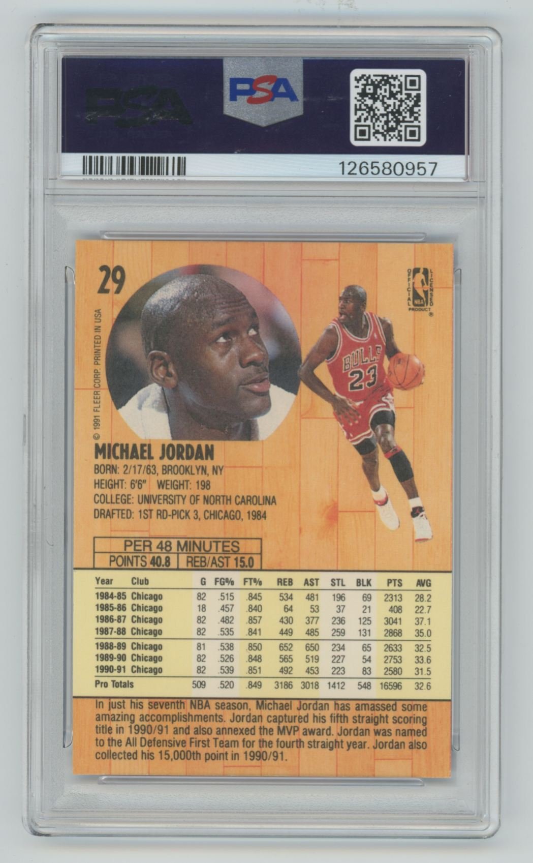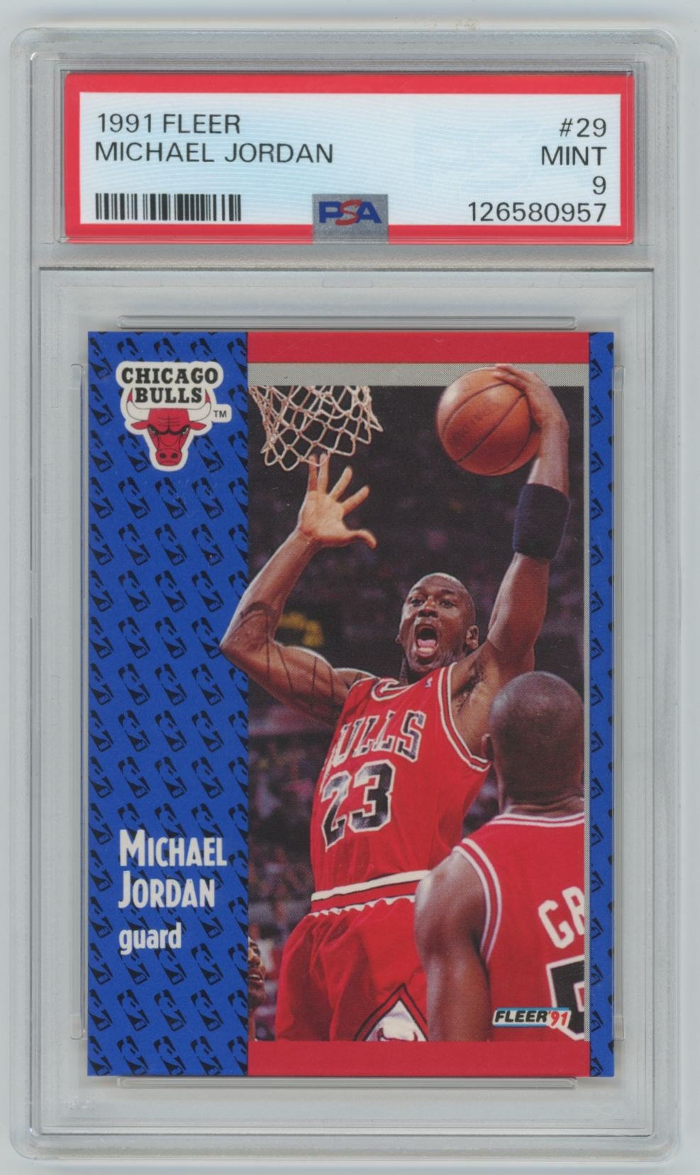 This is a 1991 Michael Jordan basketball card #29 from the Chicago Bulls in the 1991 Fleer 1991 set and is a PSA Grade 9.