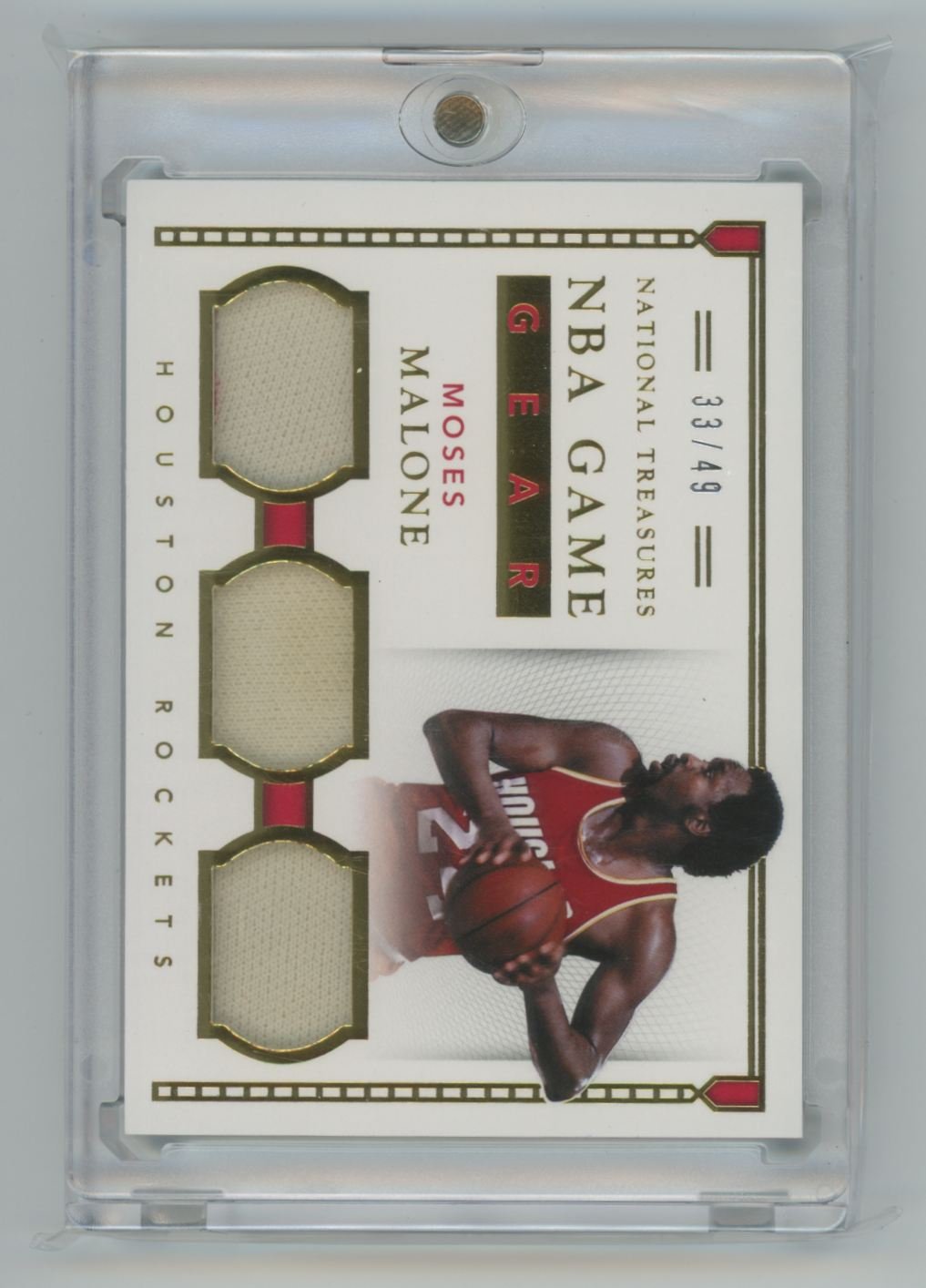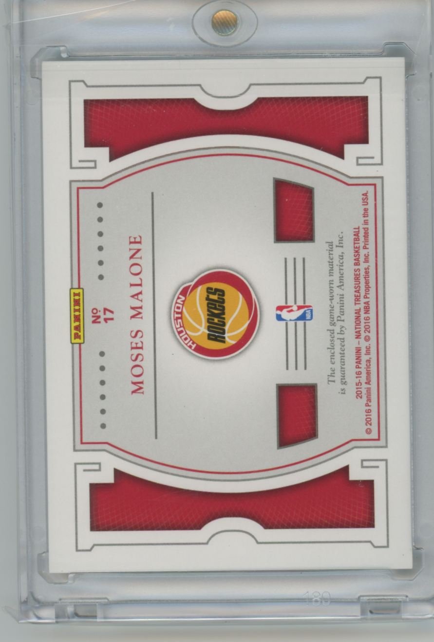 This is a 2015 Moses Malone basketball card #17 from the Houston Rockets in the 2015 Panini National Treasures set.