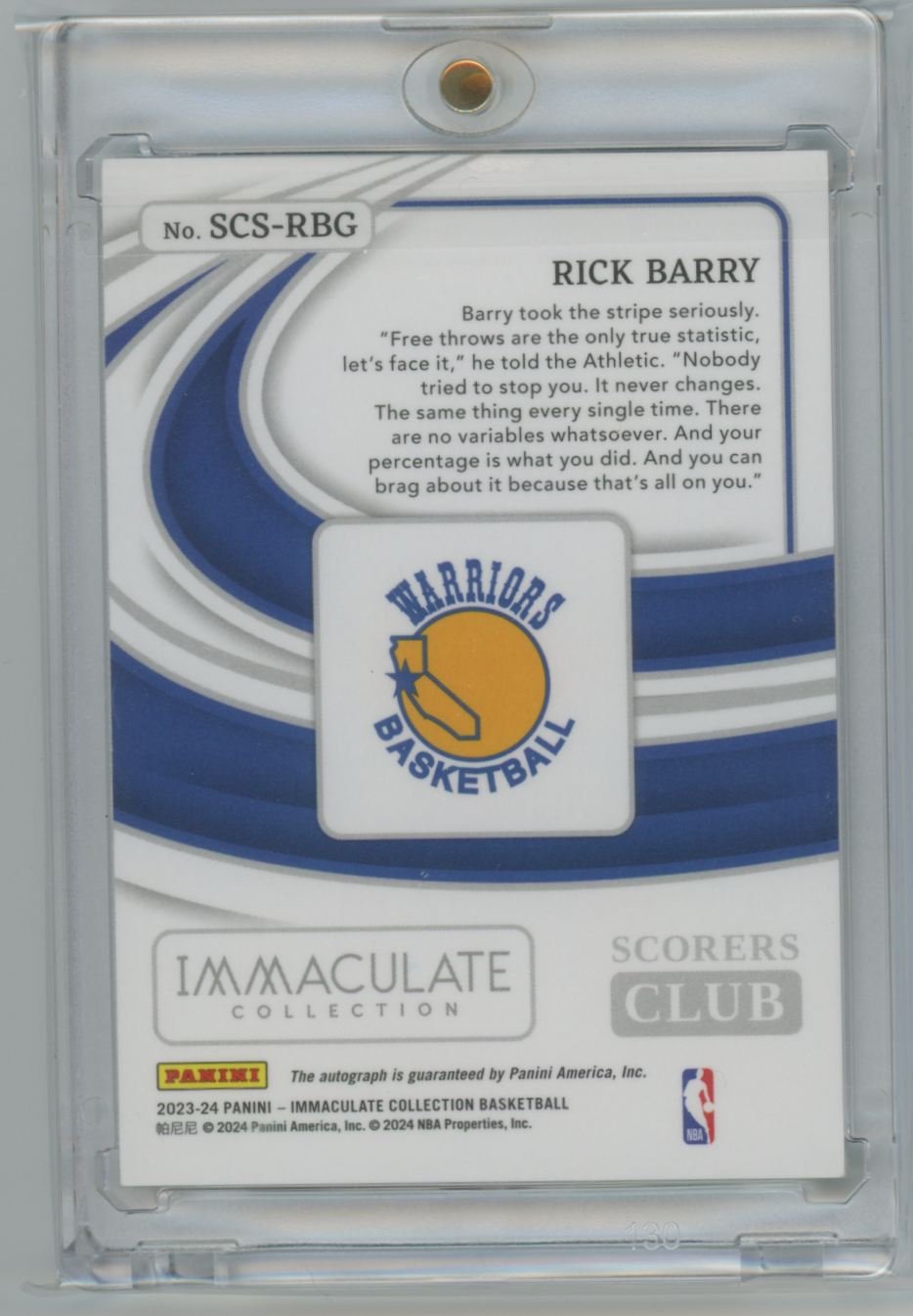 This is a 2023 Rick Barry basketball card #SCS-RBG from the Golden State Warriors in the 2023 Panini Immaculate set.