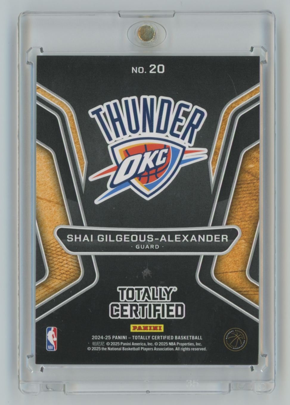 This is a 2024 Shai Gilgeous-Alexander basketball card #20 from the Oklahoma City Thunder in the 2024 Panini 2024 set.