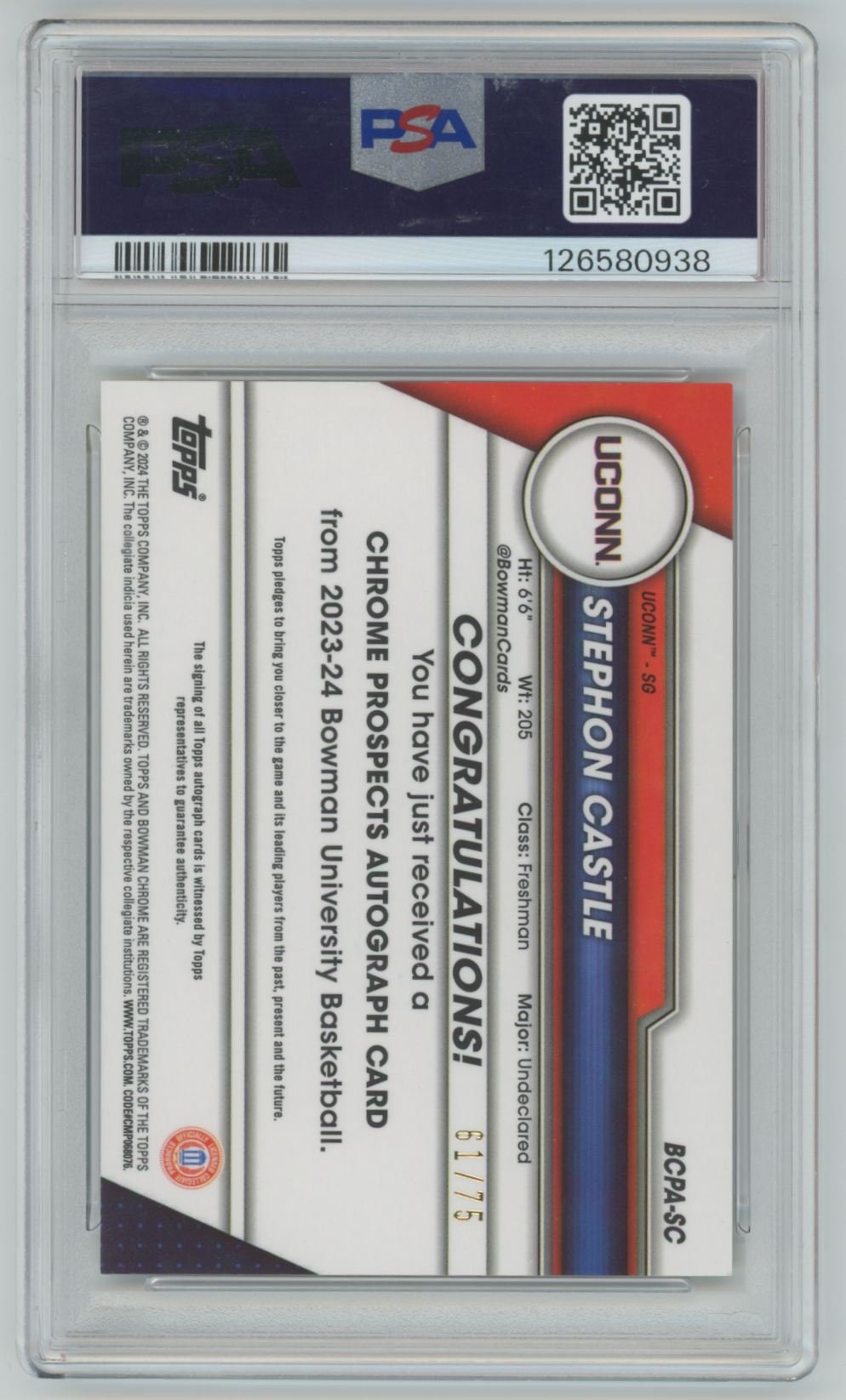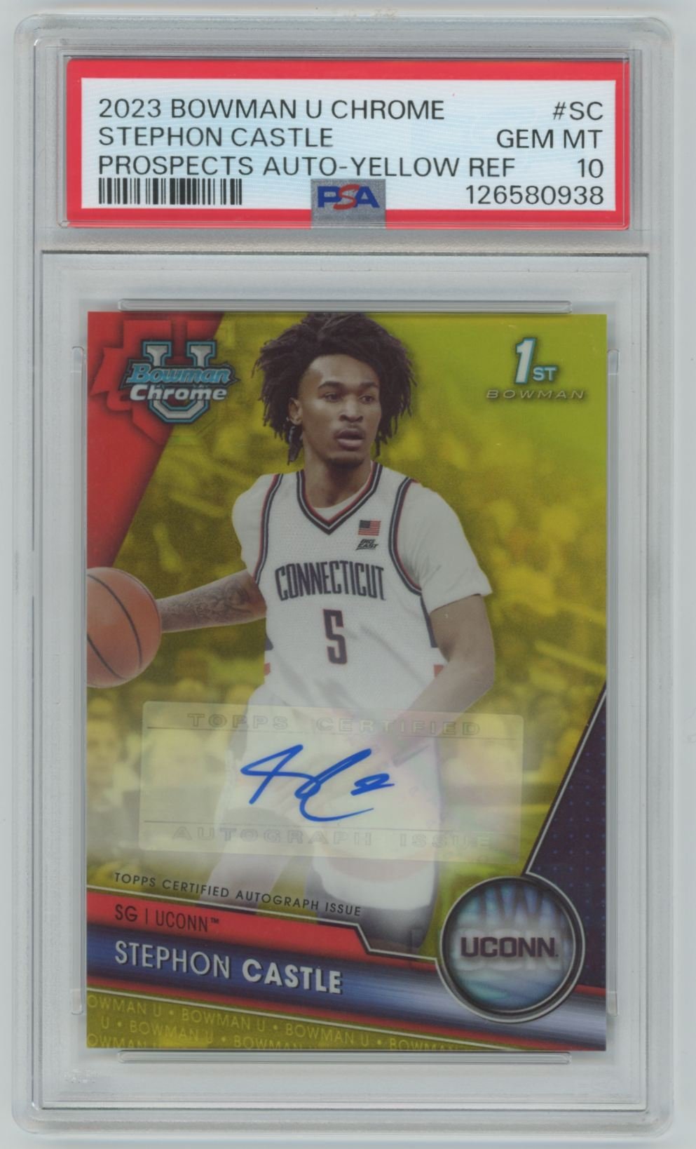 This is a 2023 Stephon Castle basketball card #BCPA-SC from the San Antonio Spurs in the 2023 Bowman U Chrome Yellow Refractor set and is a PSA Grade 10.