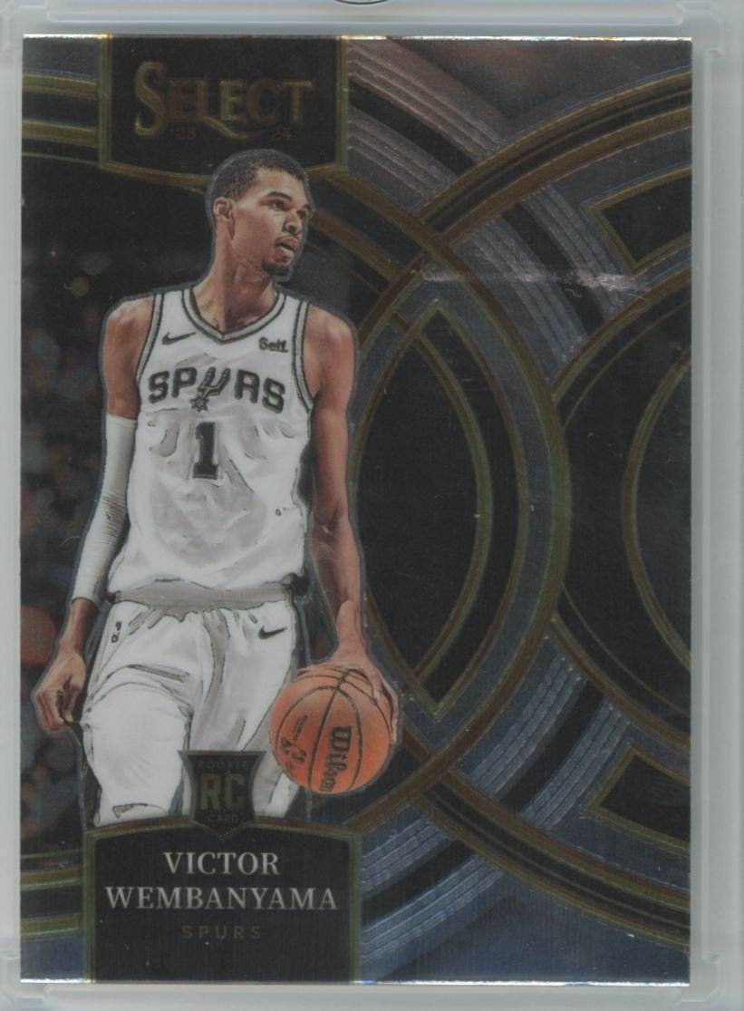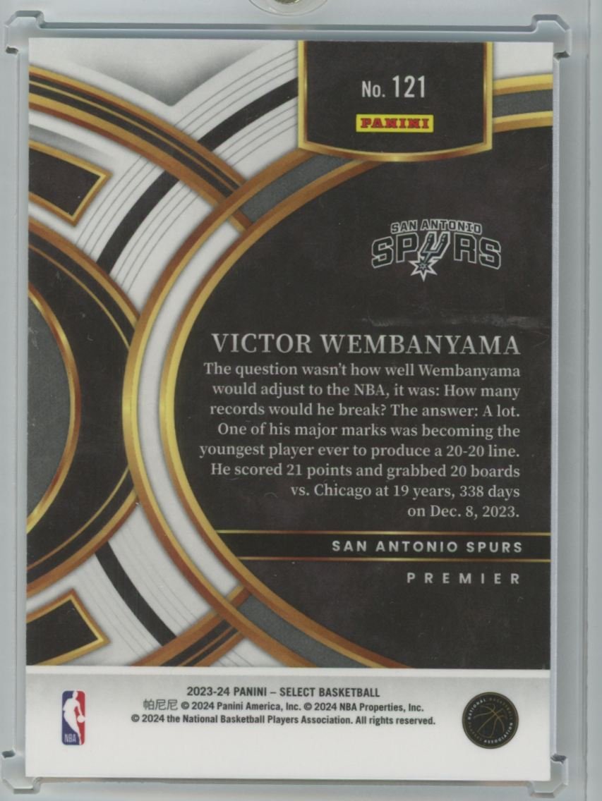 This is a 2023 Victor Wembanyama basketball card #121 from the San Antonio Spurs in the 2023 Panini Select set.