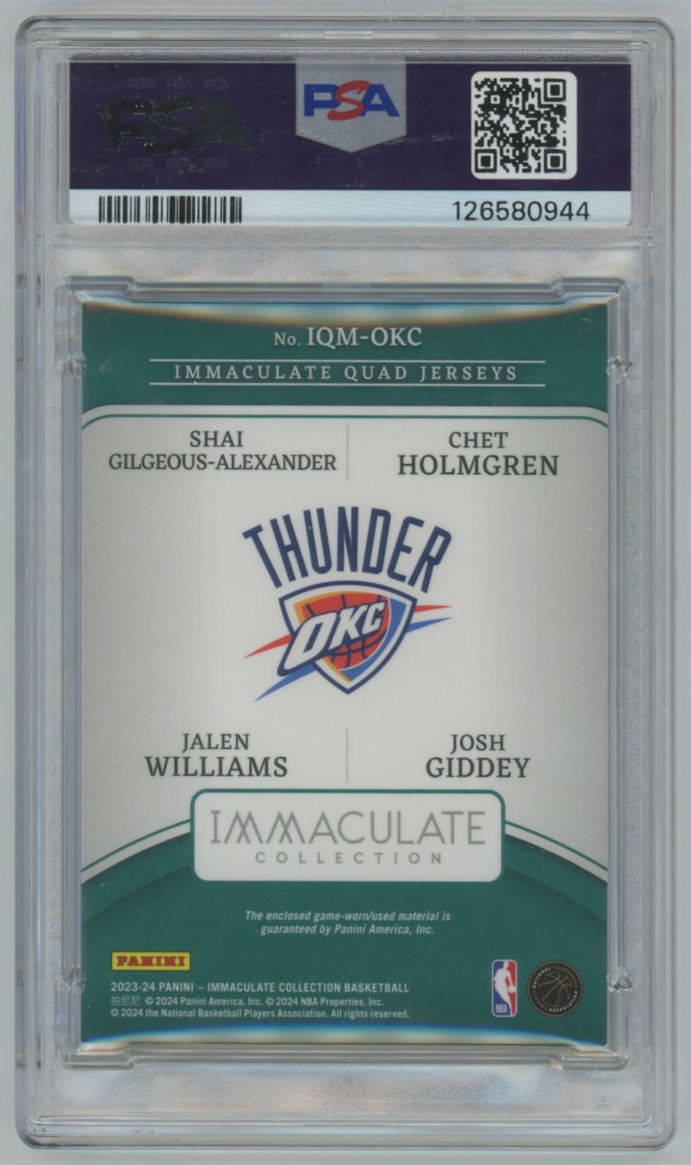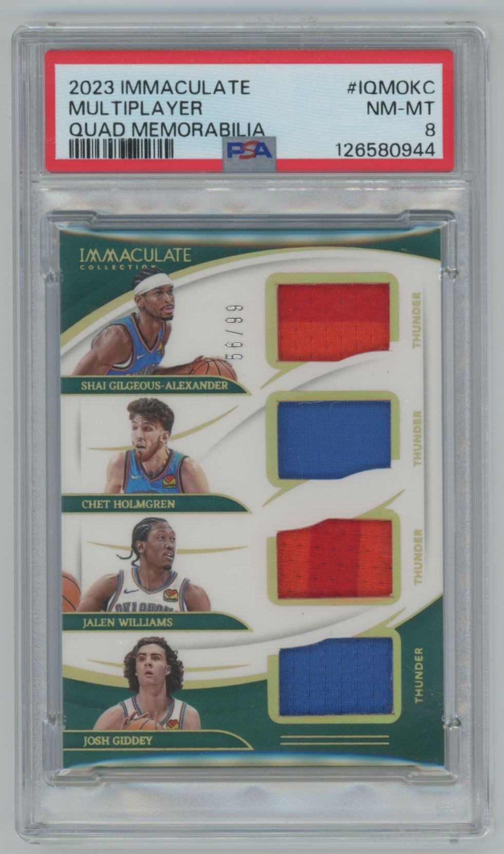 This is a 2023 Jalen Williams / Shai Gilgeous-Alexander / Josh Giddey / Chet Holmgren basketball card #IQM-OKC from the Oklahoma City Thunder in the 2023 Panini Immaculate Quad Mem set and is a PSA Grade 8.